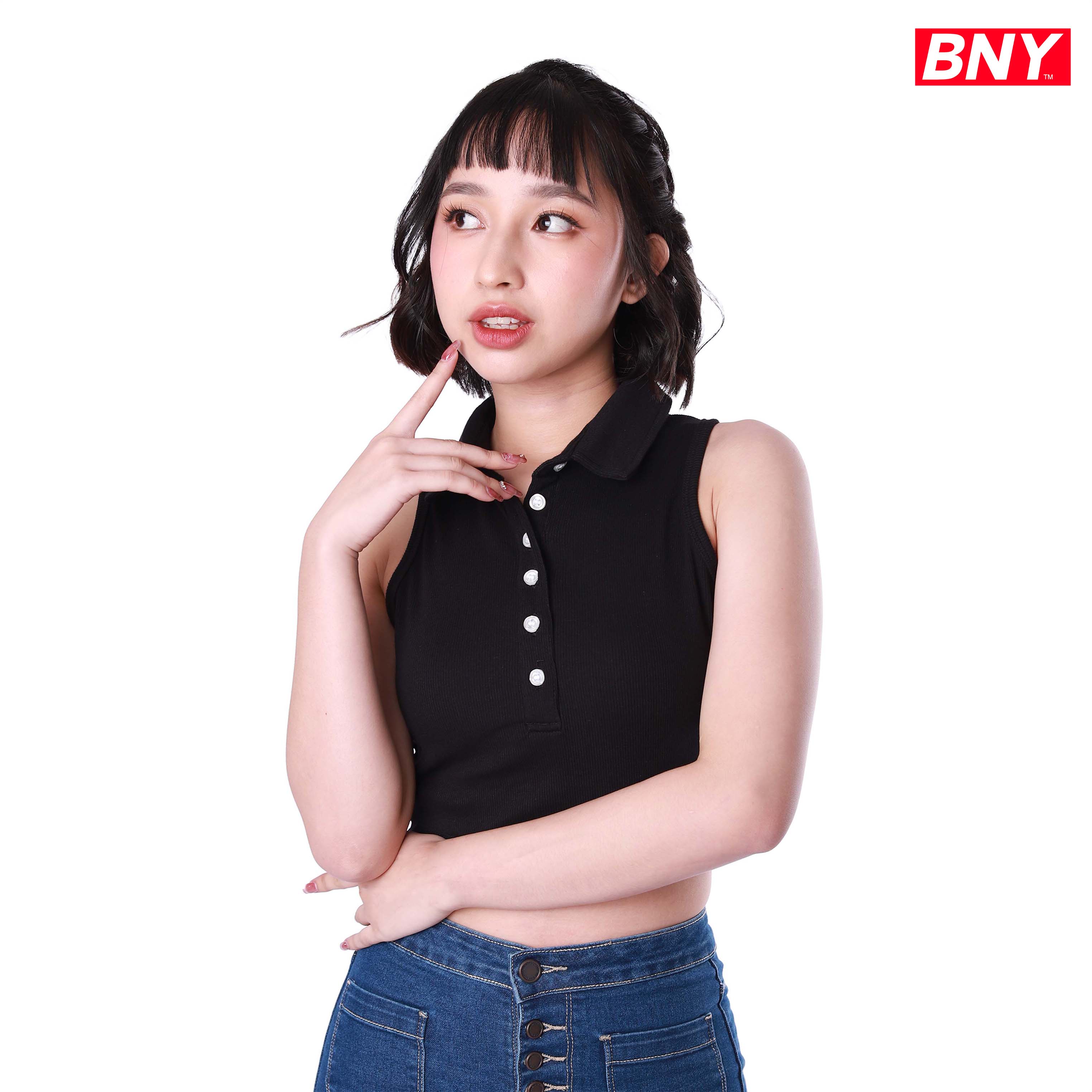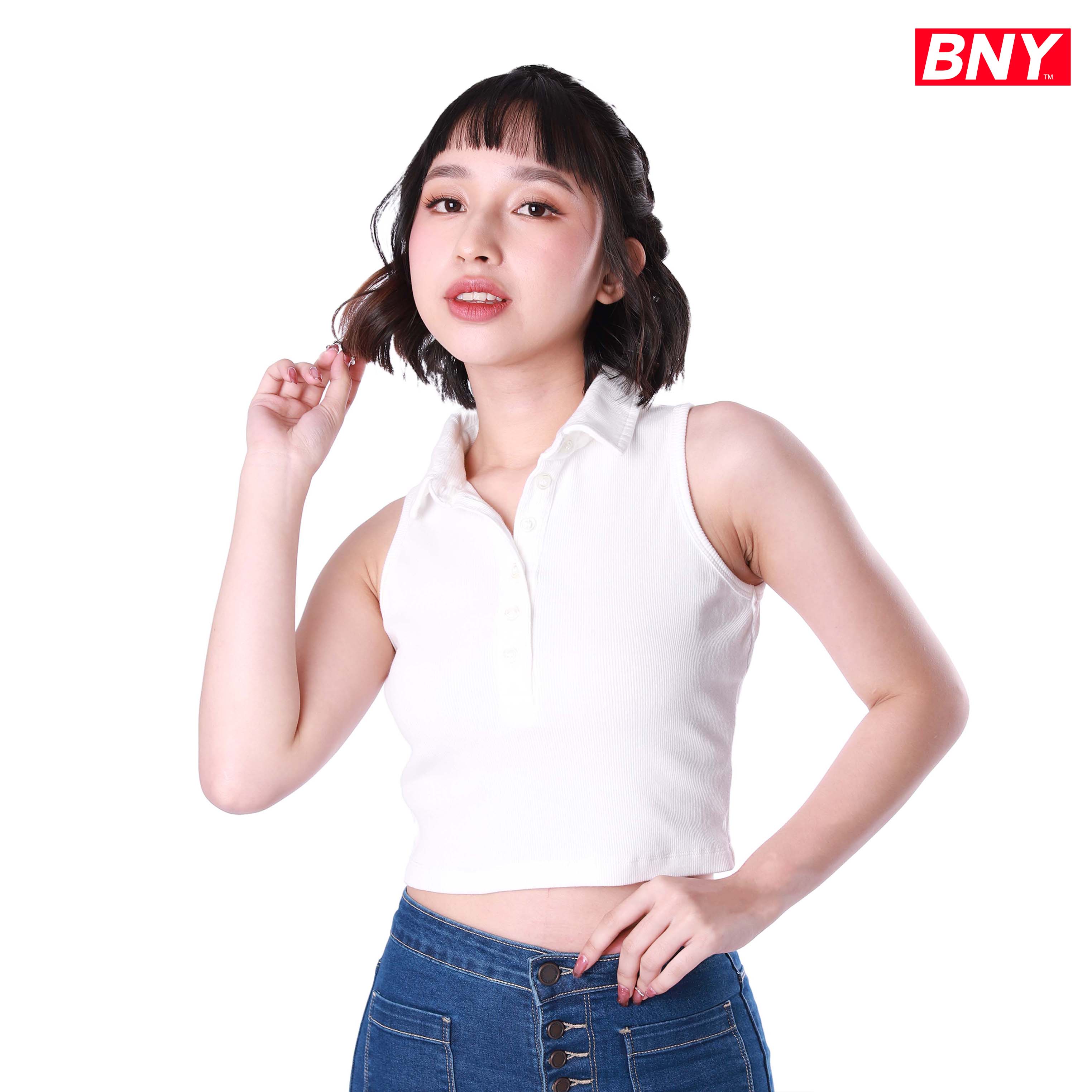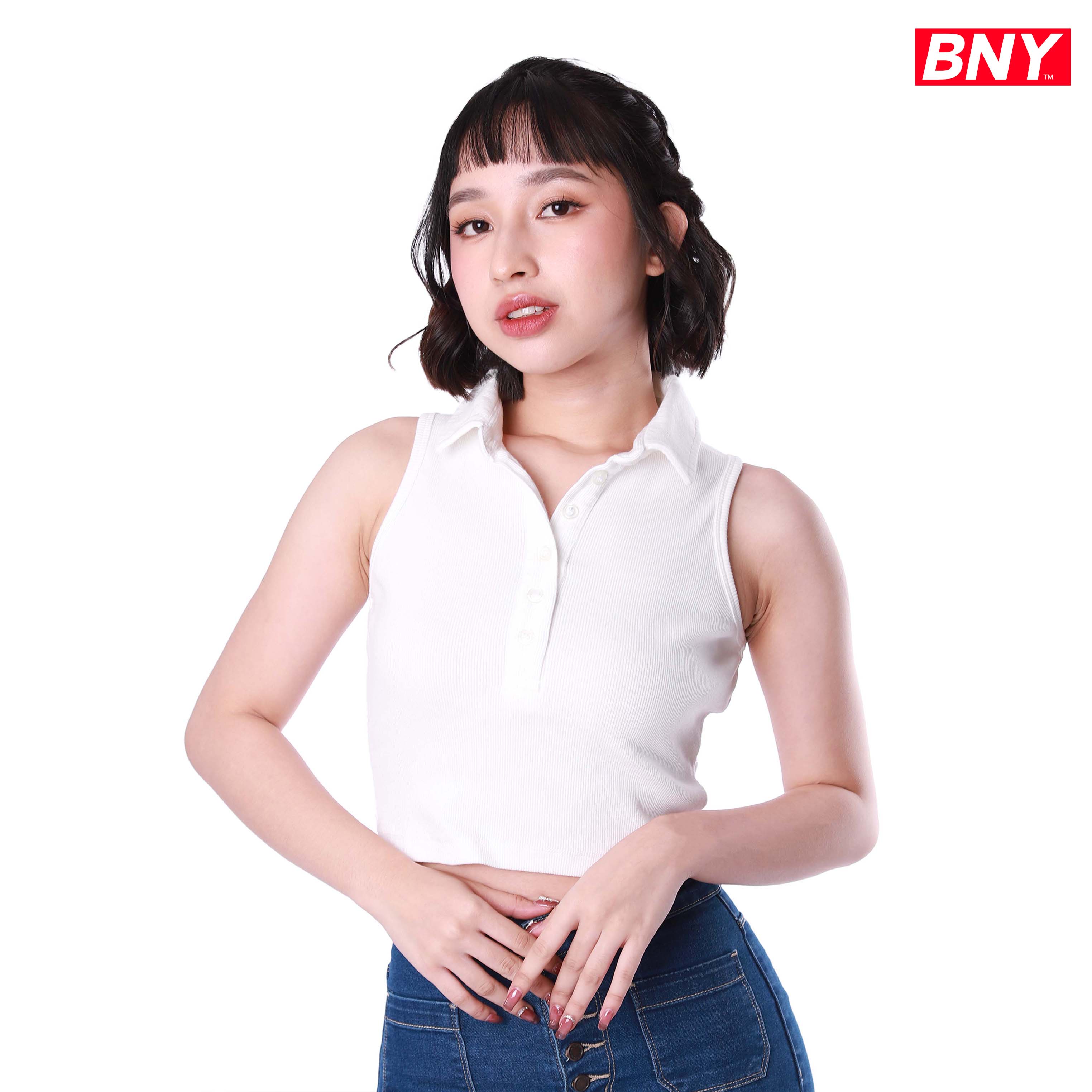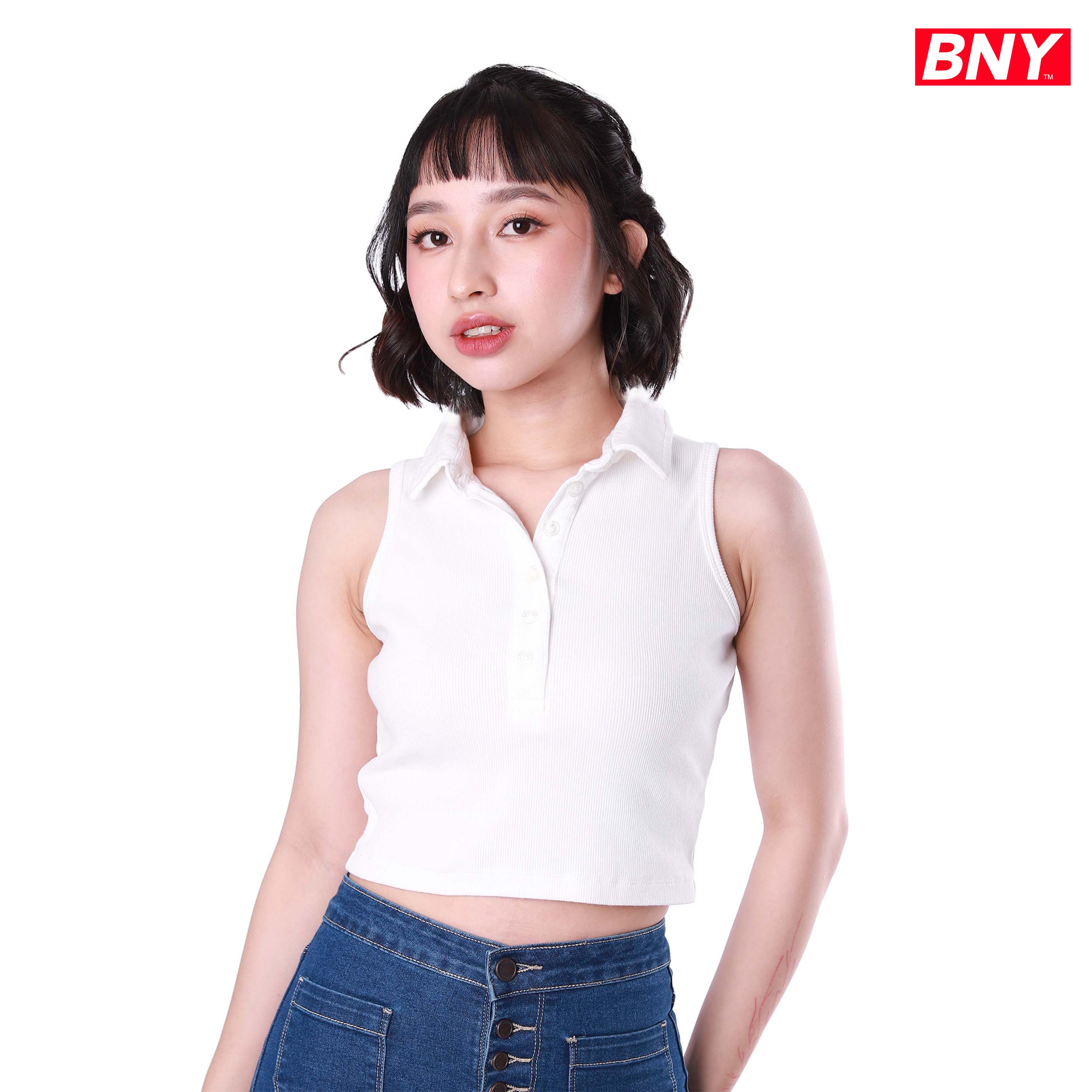 LADIES' RIB SLEEVELESS CROPPED TOP WITH COLLAR