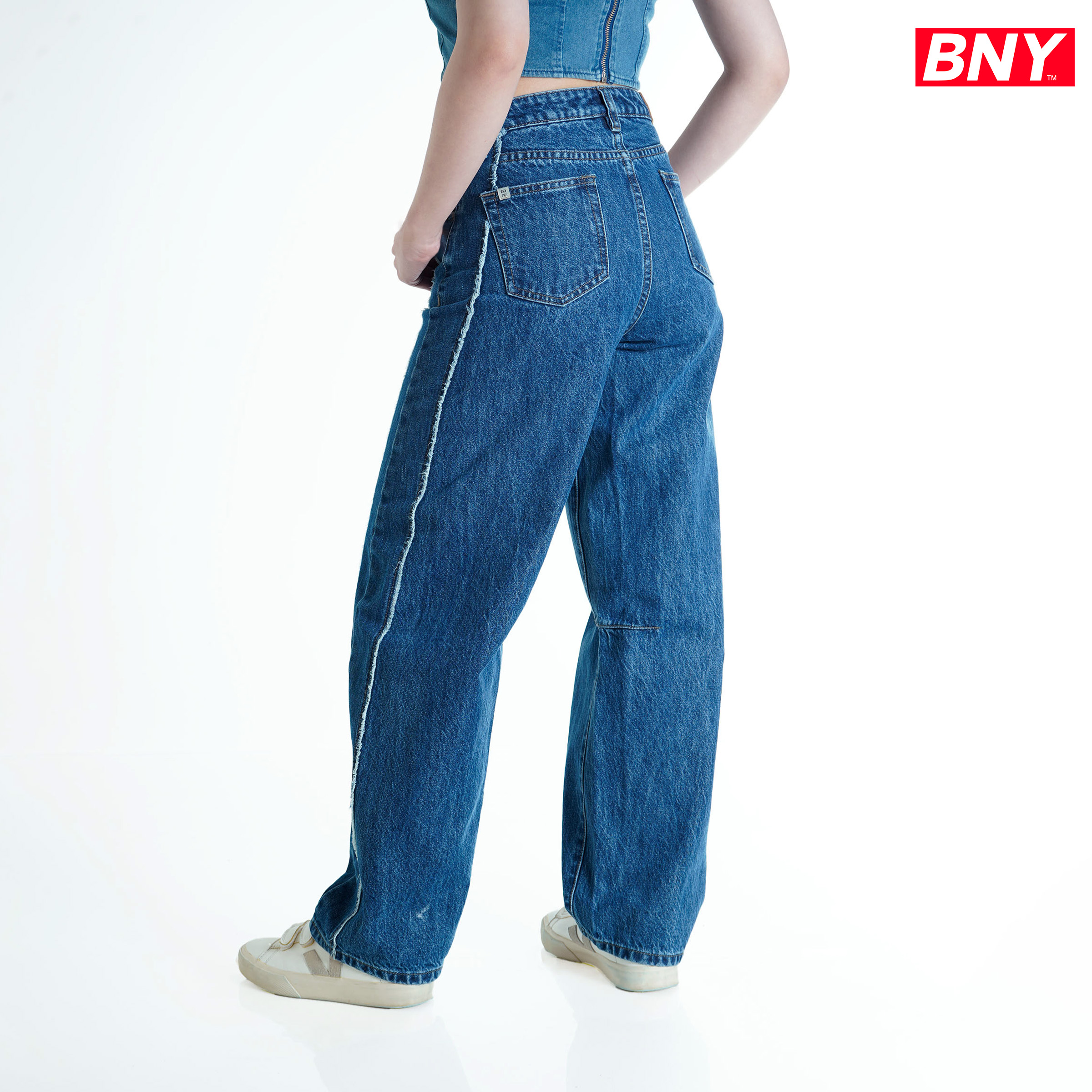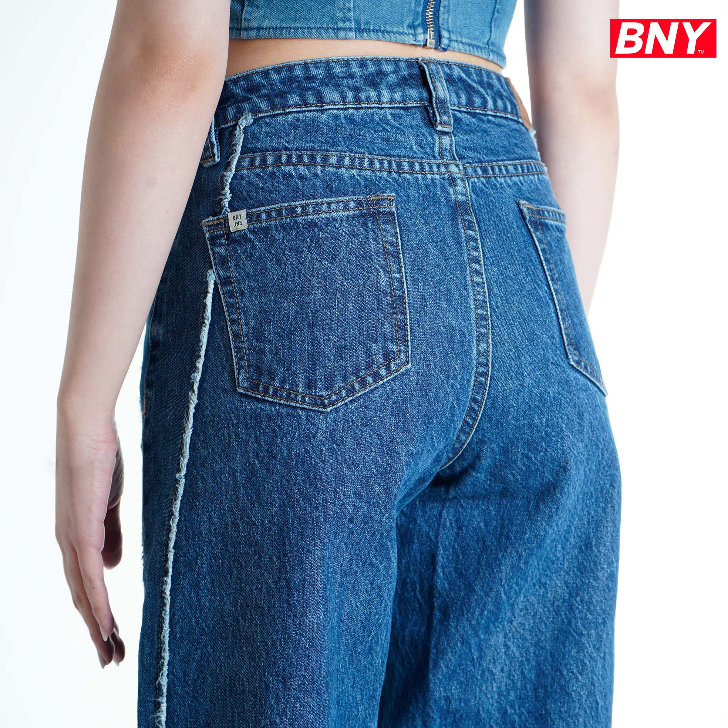 - Design : Barrel Cut Pants with Side Seam Raw Edge