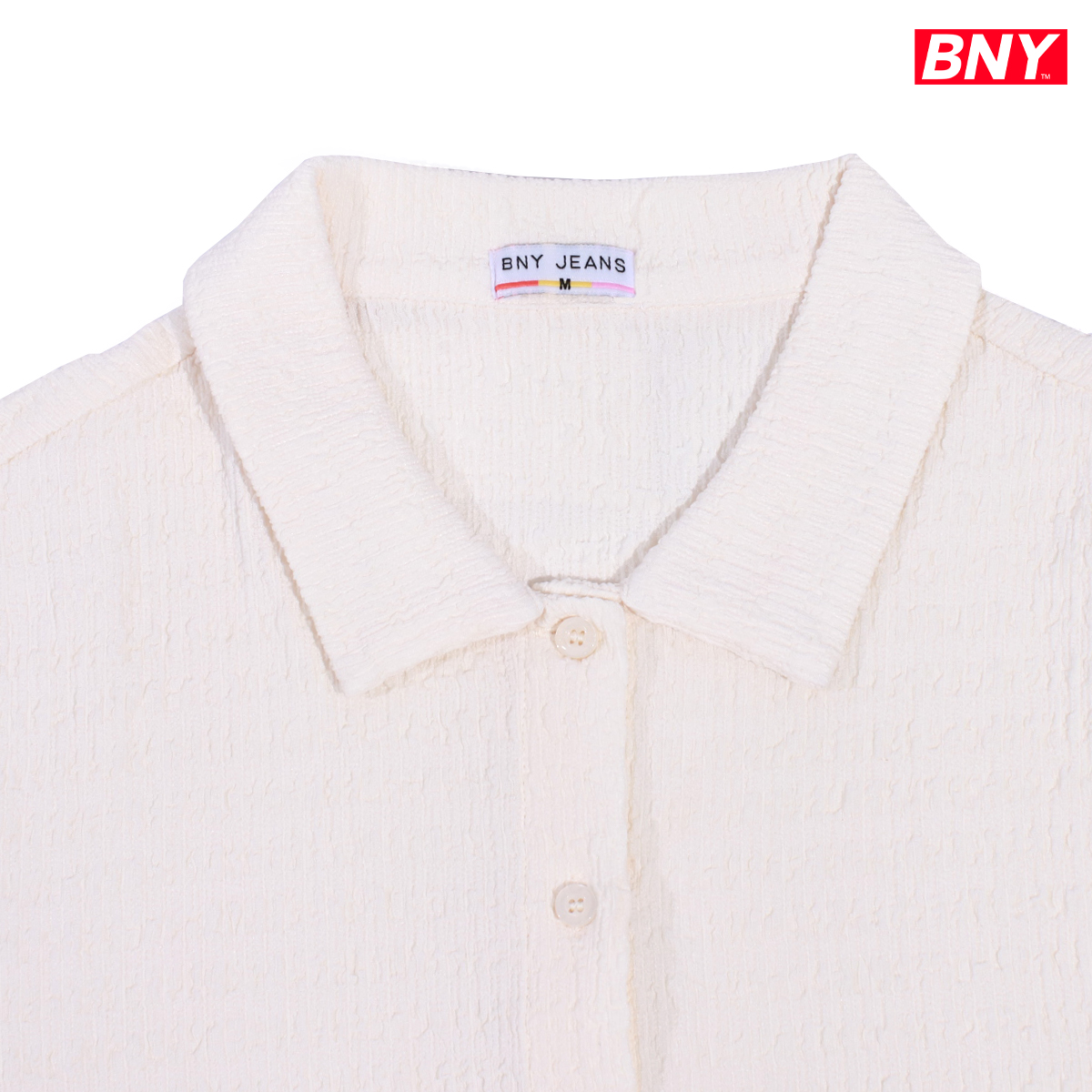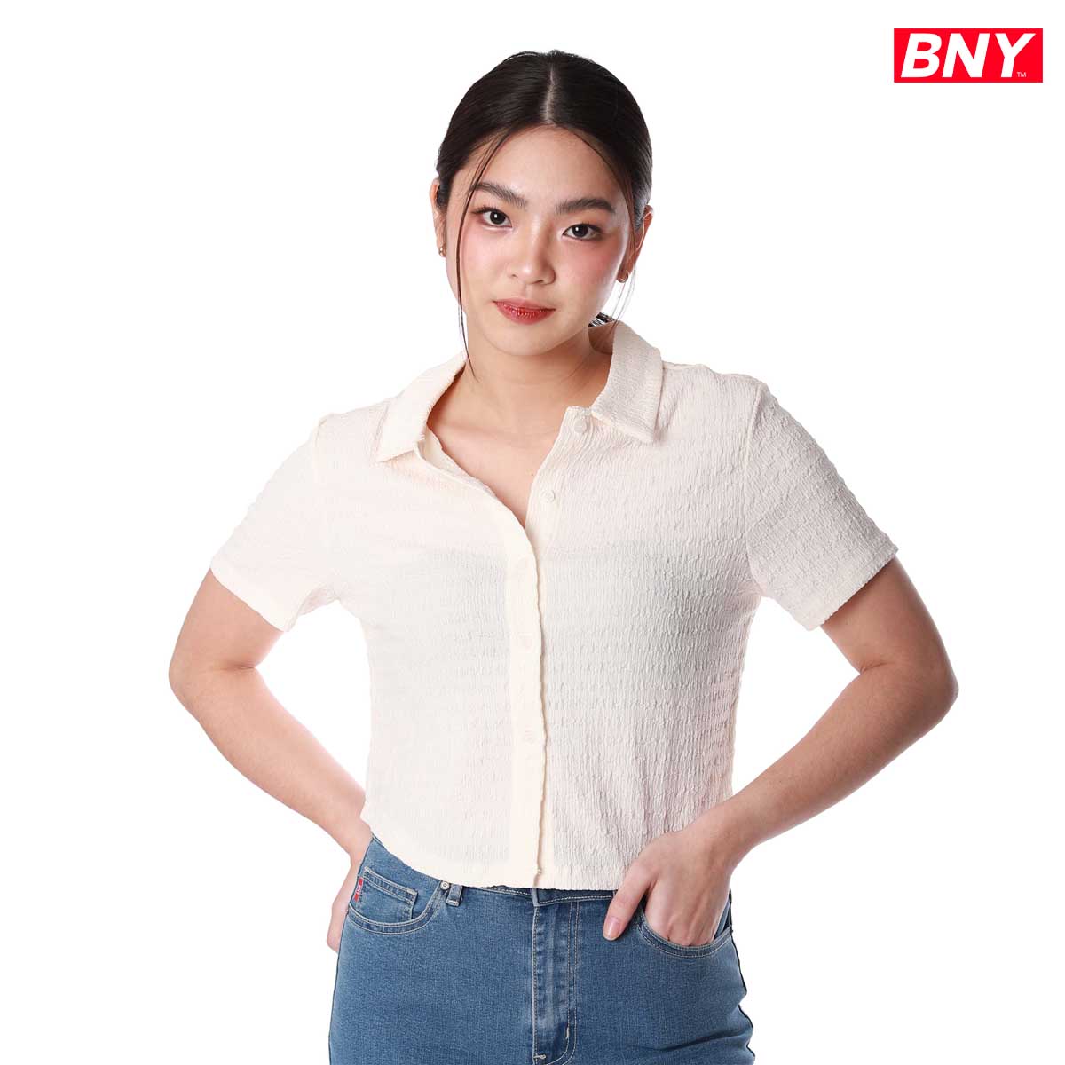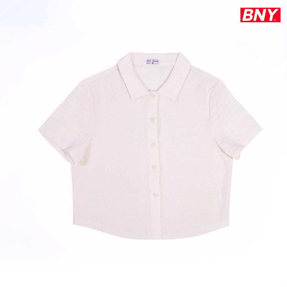 LADIES' TEXTURED CROP BUTTON DOWN TOP