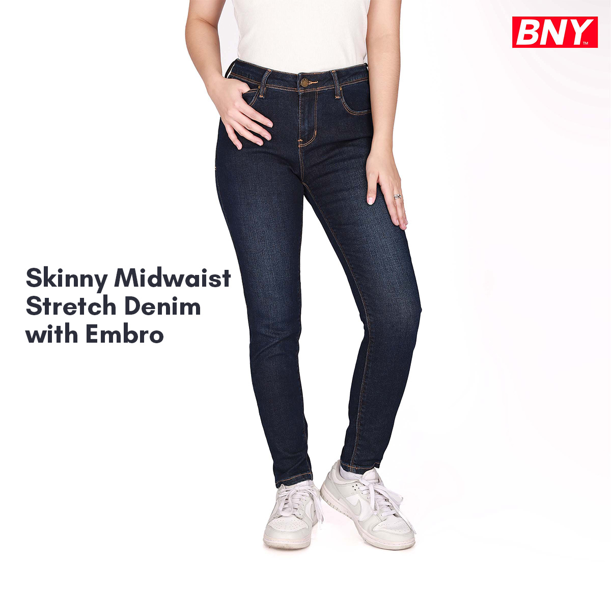 LADIES' SKINNY MIDWAIST STRETCH DENIM W/ EMBRO DETAILS